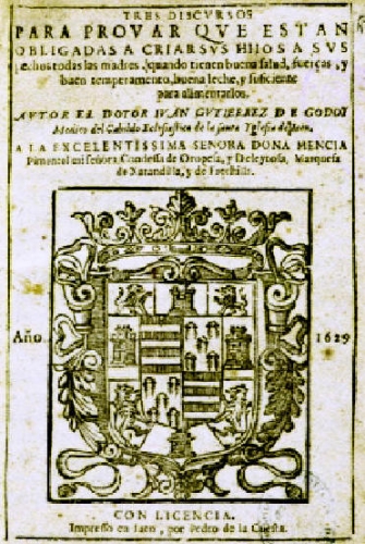 Tres discursos para probar que están obligadas a criar a sus hijos a los pechos todas las madres, cuando tienen buena salud, fuerzas, buen temperamento, buena leche y suficiente para alimentarlos (Jaén, 1629 por Juan de la Cuesta, en 4º)