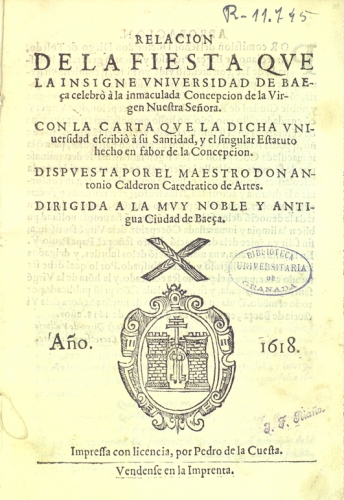 En este curioso libro el autor reunió, entre otros textos, los poemas que formaron parte de los certámenes literarios convocados por la Universidad de Baeza en diciembre de 1617, con ocasión de la fiesta dedicada a la Inmaculada Concepción. Calderón fue uno de los seis jueces de la justa poética. Aparecen también incluidos dos poemas latinos del propio Calderón: